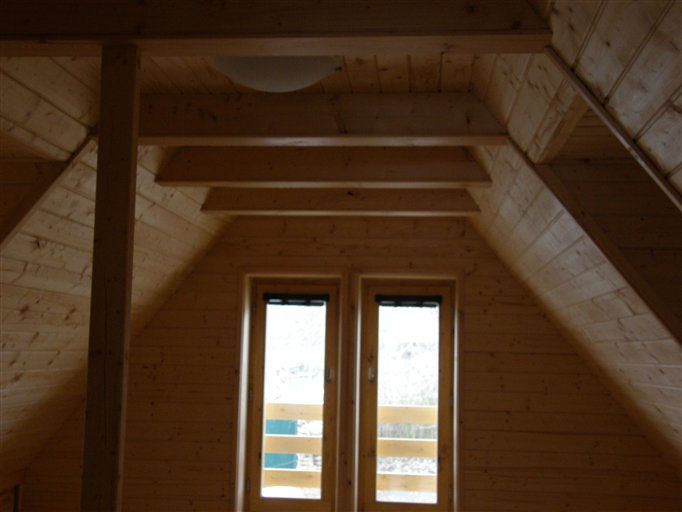 Cena zahrnuje : montáž, střešní krytinu (barva dle výběru zákazníka), podlahy v přízemí zakončené OSB deskami, dřevné podlahy v podkroví, okna, vnitřní i venkovní dveře, zábradlí, ukončení vnitřních a vnějších stěn palubkami, fermacellem nebo omítkou a zateplení.
